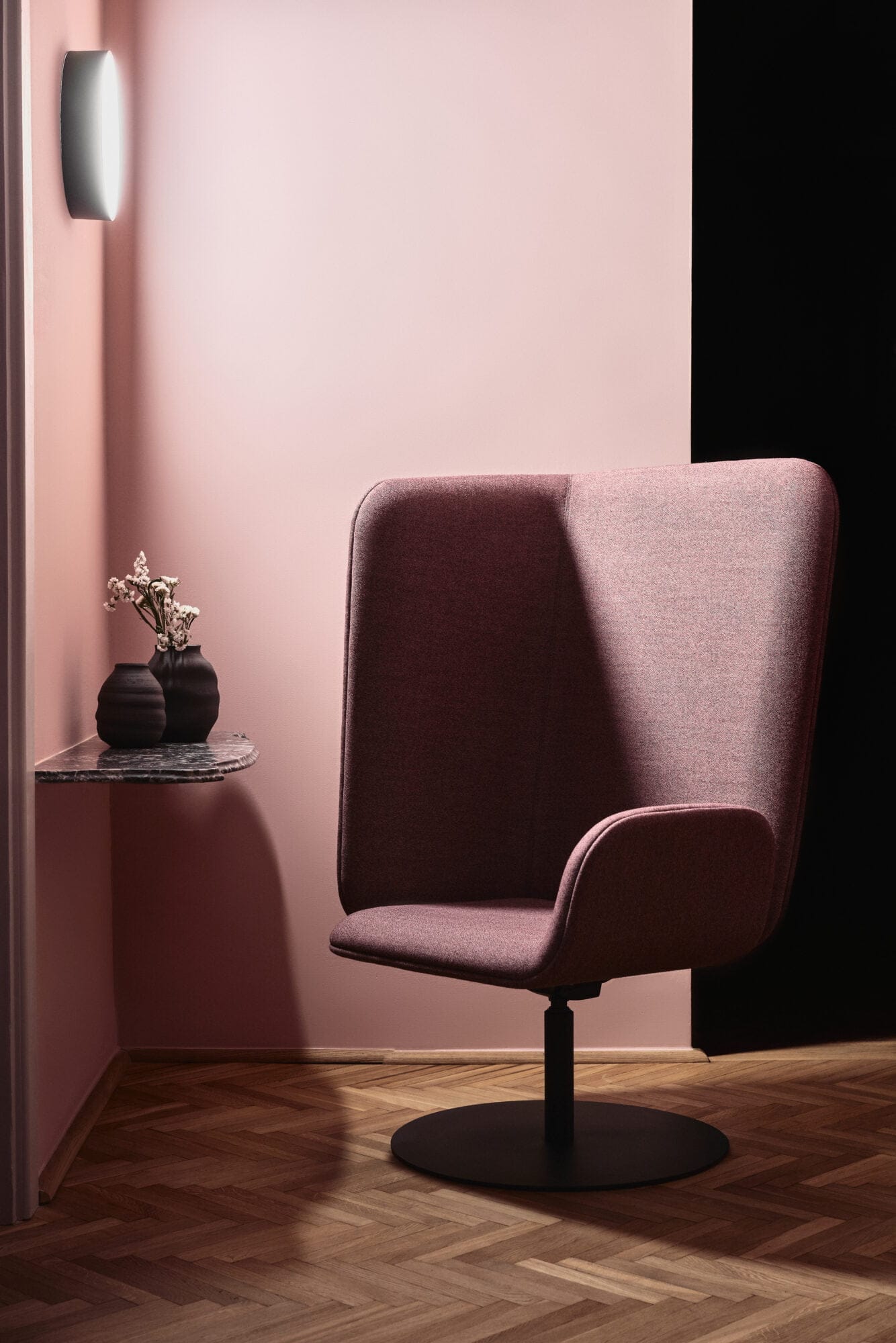 Wyrazista, wysoka forma tworzy wrażenie prywatnej niszy, ale dzięki smukłej, stalowej podstawie fotel zachowuje wizualną lekkość. Shieldon dobrze sprawdza się w przestrzeniach komercyjnych oraz mieszkalnych – od stref pracy i odpoczynku po bardziej kameralne miejsca, gdzie liczy się poczucie prywatności i wyciszenia.