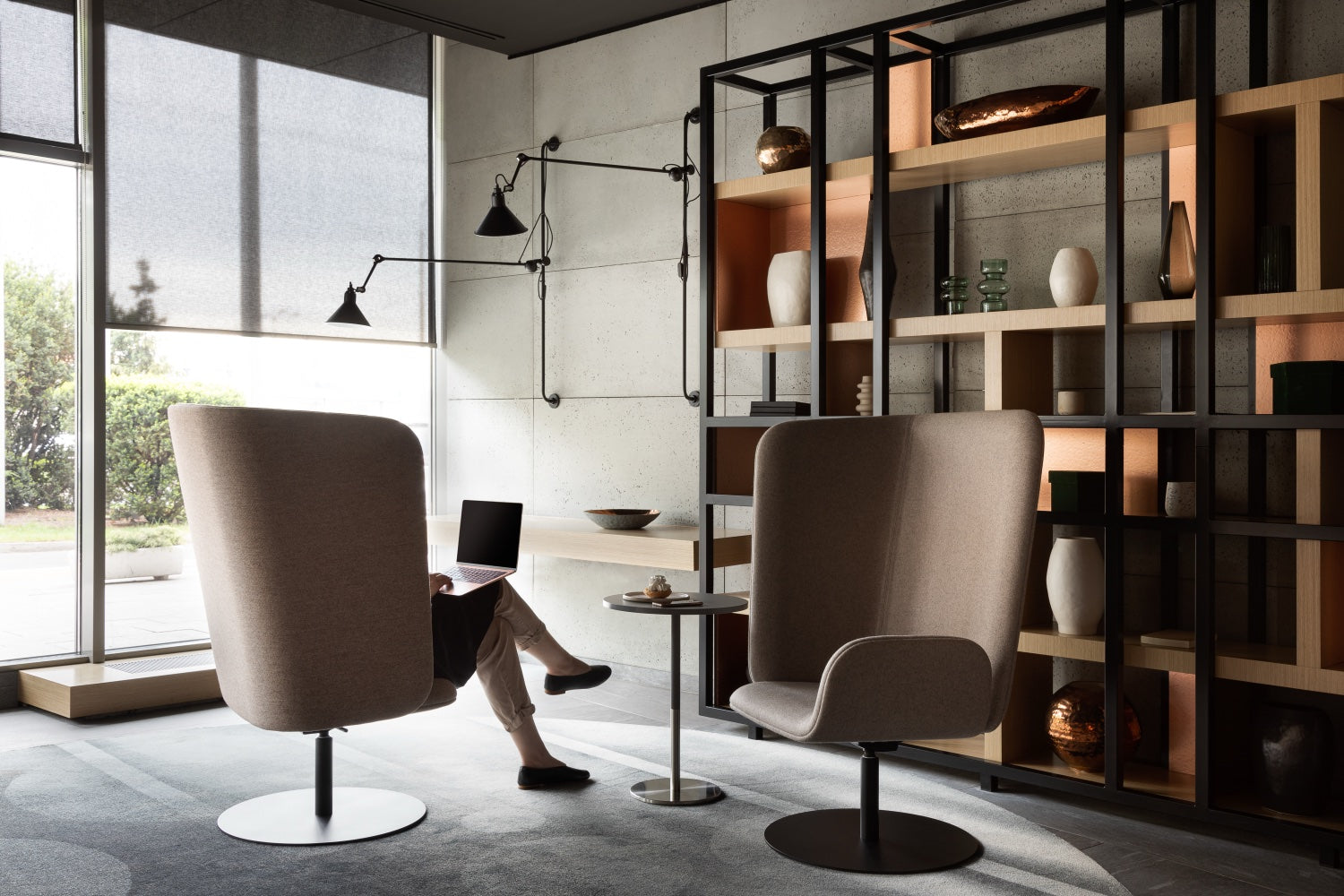 Druga strona fotela pozostaje otwarta, dzięki czemu Shieldon nie zamyka użytkownika całkowicie – pozwala na swobodny kontakt, rozmowę czy pracę zespołową, kiedy jest to potrzebne. Obrotowe i odchylane siedzisko dopasowuje się do preferencji osoby siedzącej, zapewniając wygodę zarówno podczas krótkiego spotkania, jak i dłuższej pracy z laptopem czy czytania.