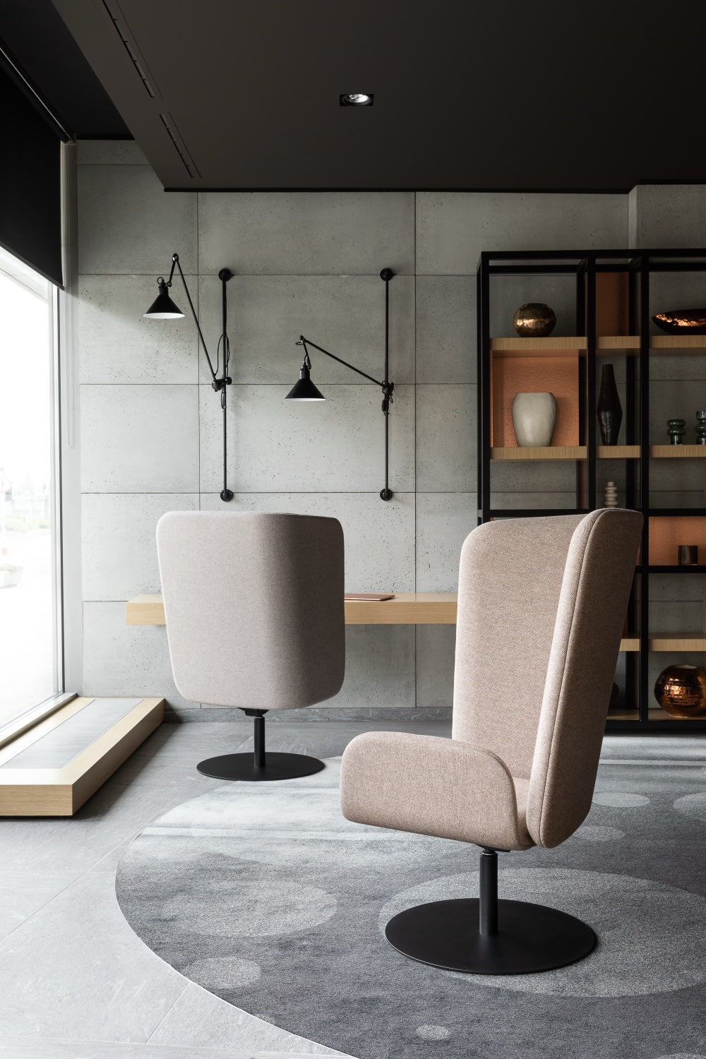 Siedzisko z funkcją obrotu i odchylenia zapewnia wysoki komfort, a kompaktowe wymiary ułatwiają ustawienie fotela w różnych układach przestrzennych. Możliwość tapicerowania wnętrza i zewnętrza w różnych tkaninach lub skórze pozwala podkreślić zarówno stronę „prywatną”, jak i tę skierowaną do wnętrza.
