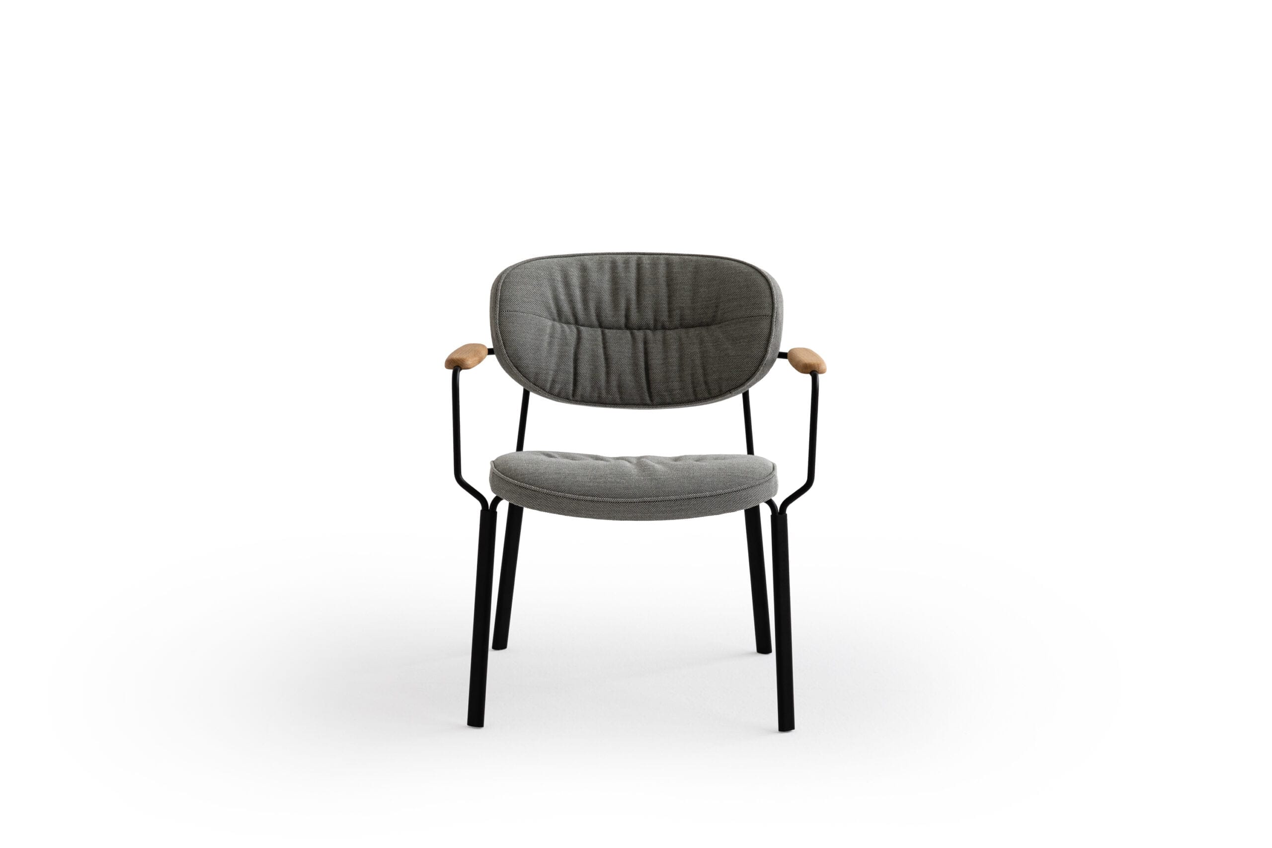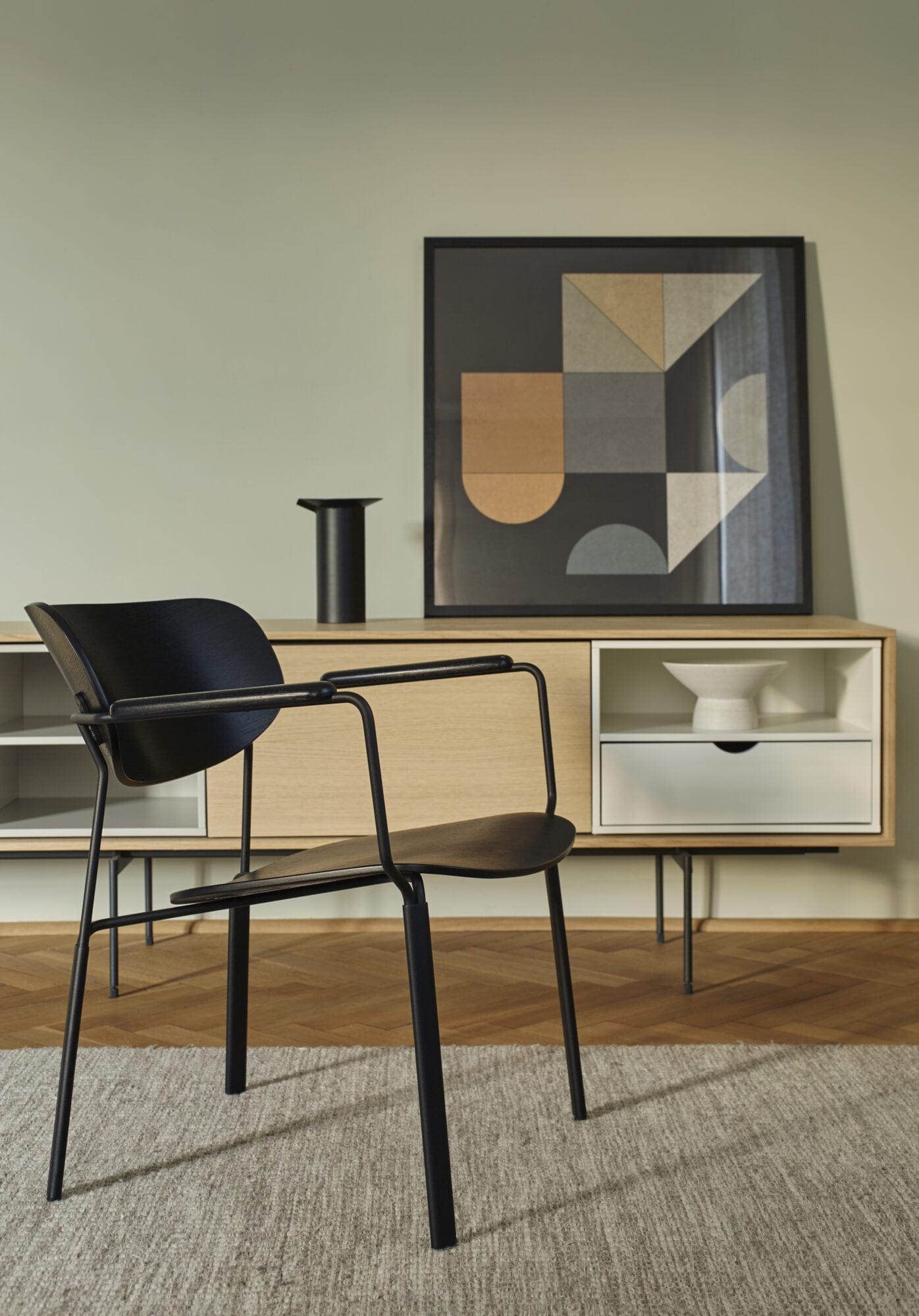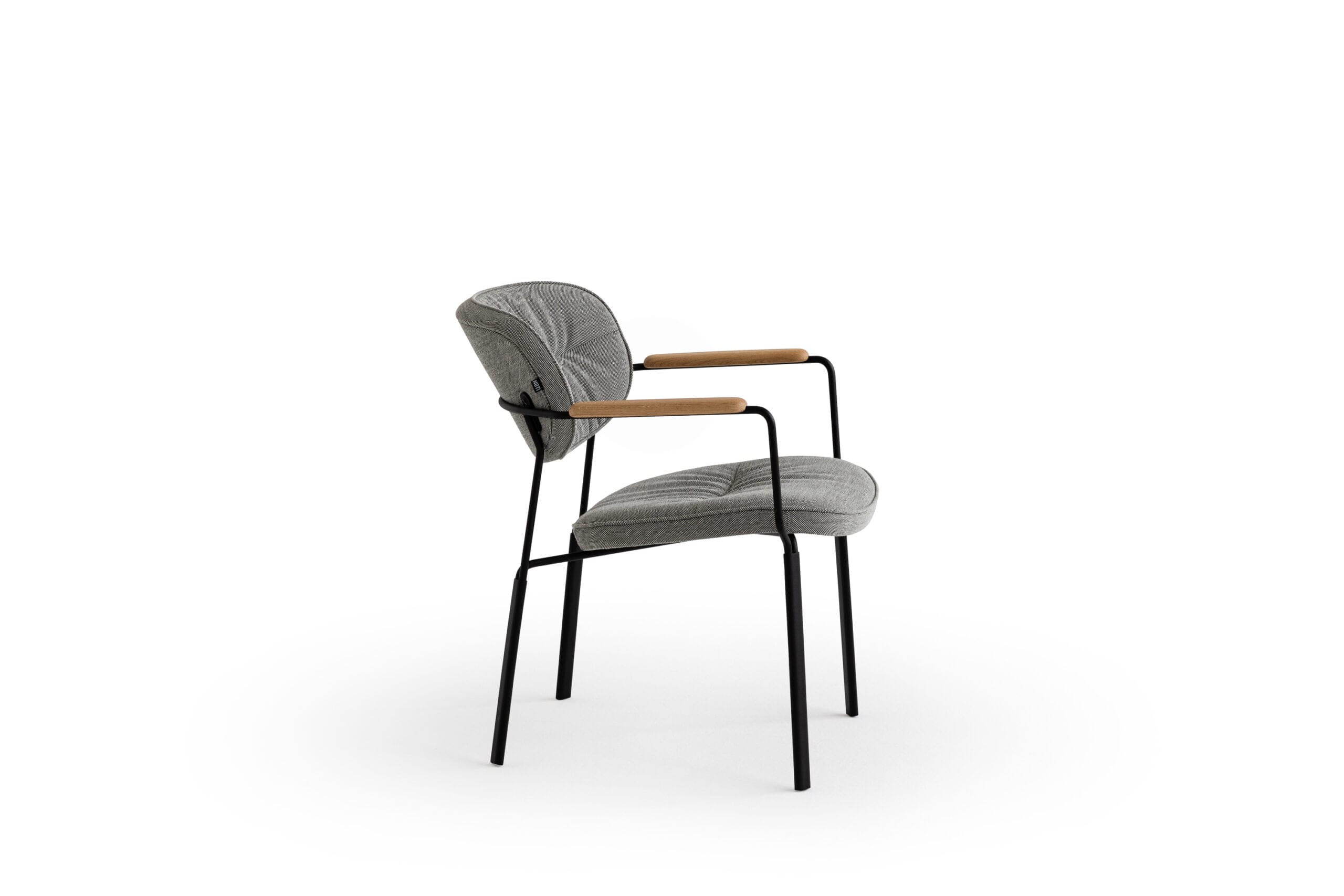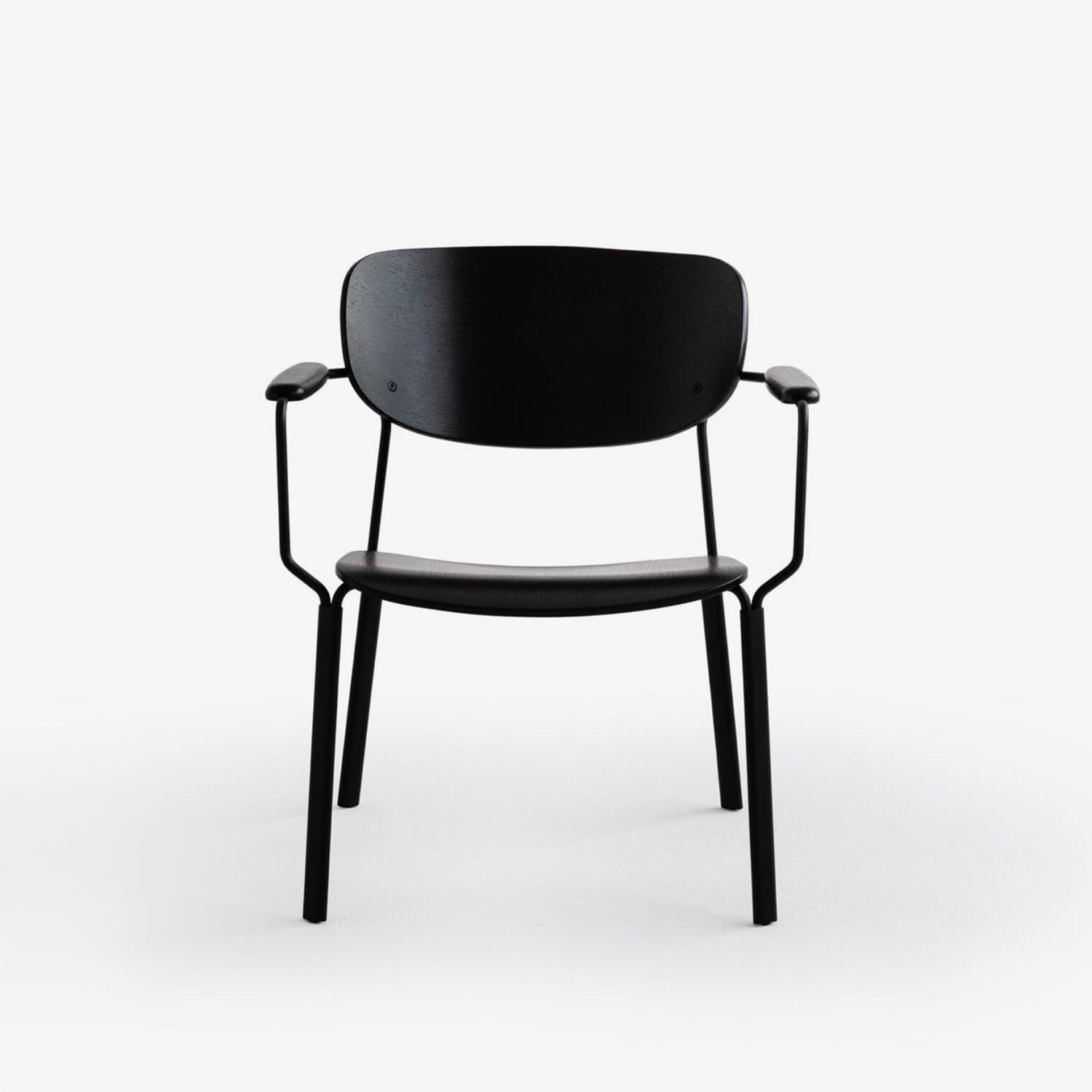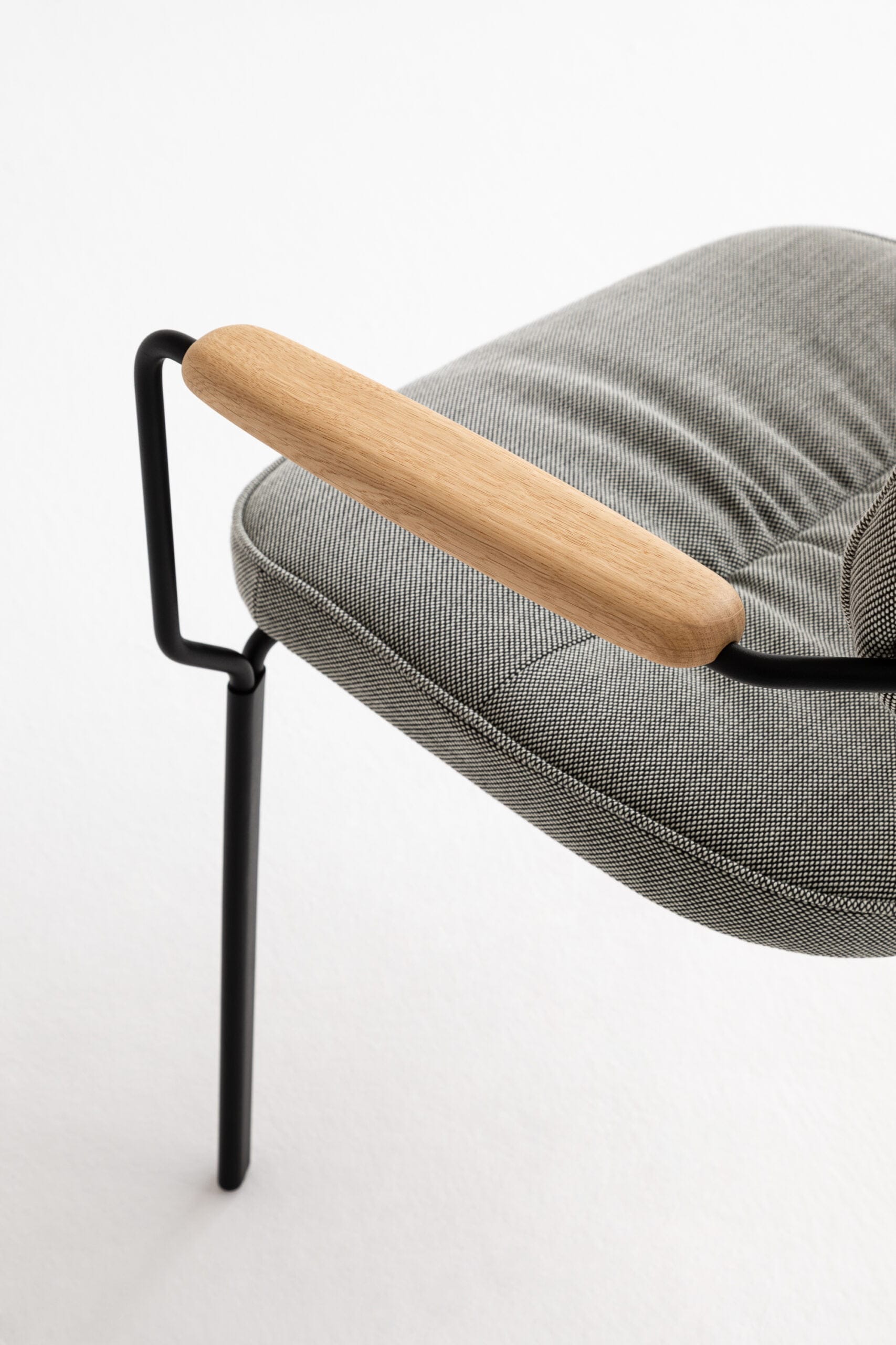 Kolekcja obejmuje krzesło i fotel w dwóch podstawowych wersjach: z kubełkiem ze sklejki bukowej wykończonej okleiną dębową oraz w wersji tapicerowanej, z pianką poliuretanową pod tkaniną lub skórą. We wszystkich wariantach zastosowano dębowe podłokietniki, zawsze w kolorze dopasowanym do wybarwienia okleiny, co podkreśla spójność projektu.
