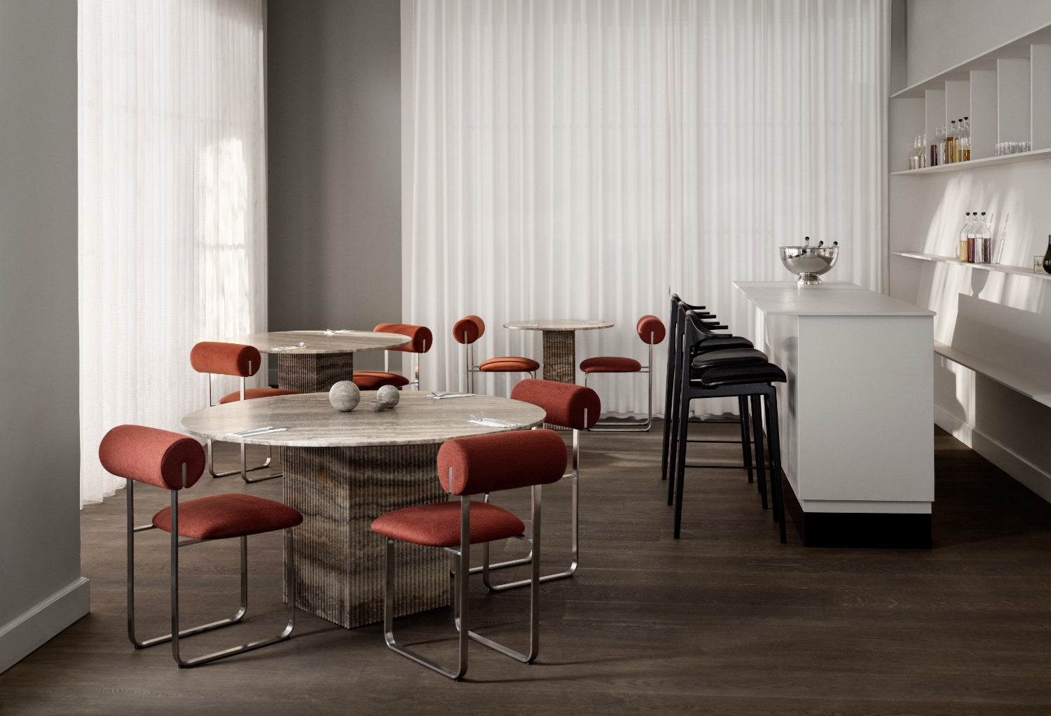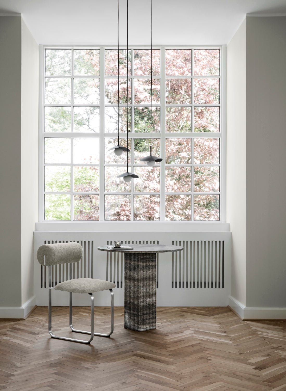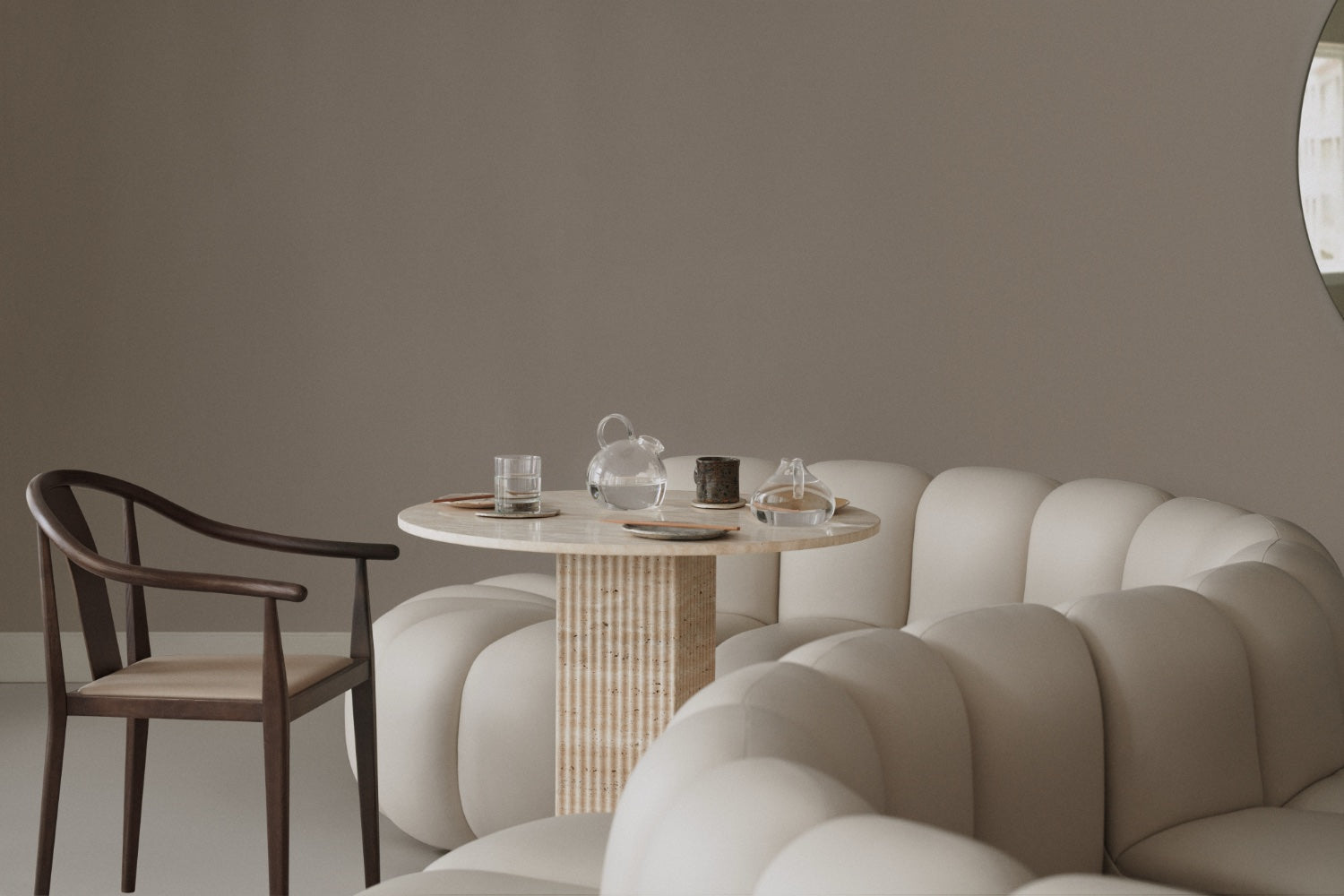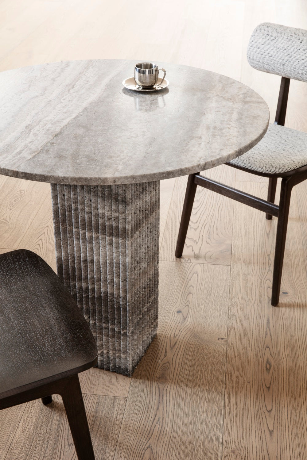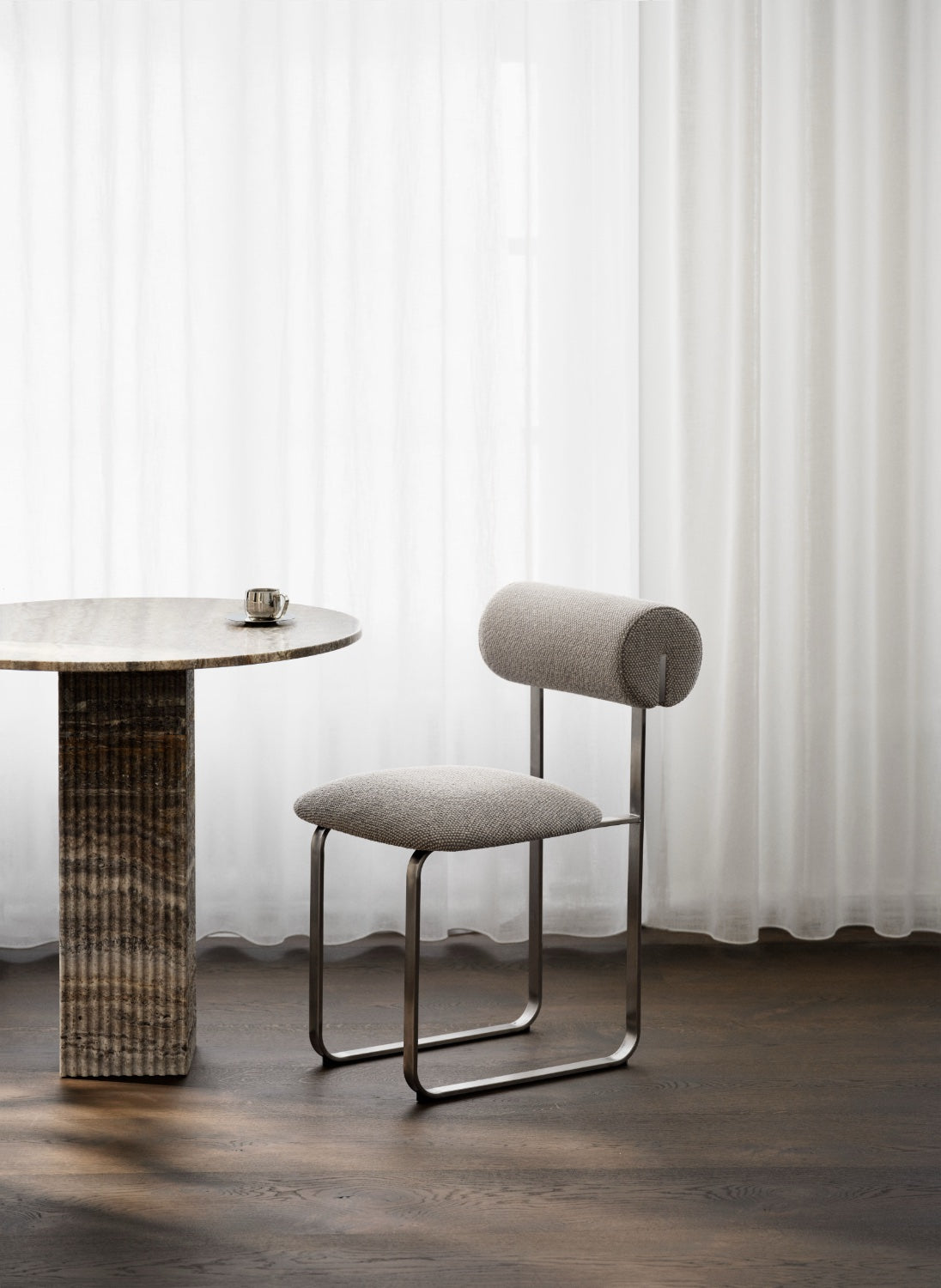 Stół jadalniany Soho, zaprojektowany przez Kristiana Sofusa Hansena i Tommy'ego Hyldahla w 2023 roku, to mistrzowskie studium kontrastu. Stół posiada solidną, żłobioną kolumnę bazową, która stanowi mocny kontrapunkt dla cienkiego, lekkiego blatu .