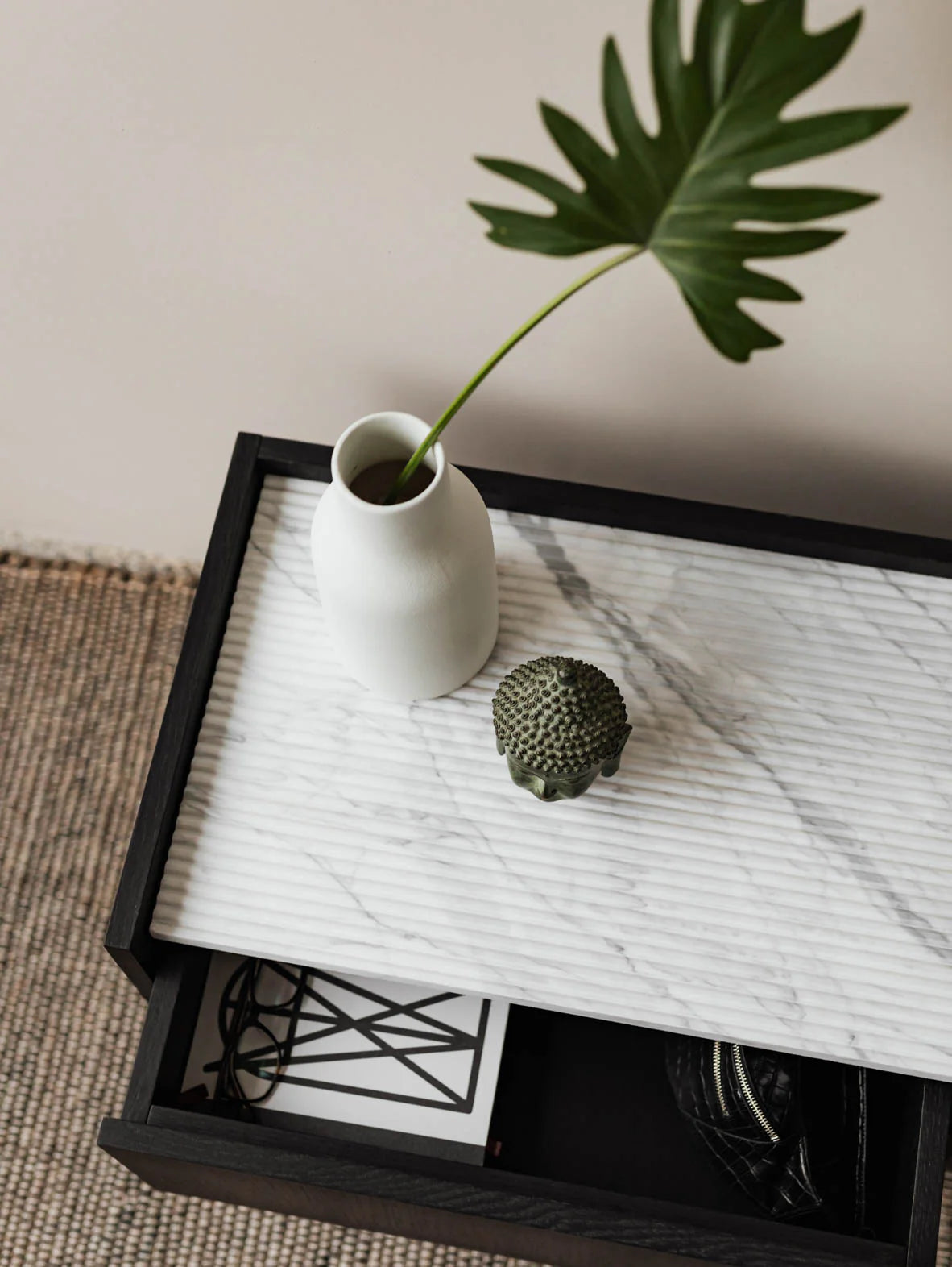 Szlachetny monolit: Górny blat wykonany w całości z naturalnego kamienia (marmuru lub trawertynu) stanowi luksusową podstawę pod gramofon, lampę lub wazon.