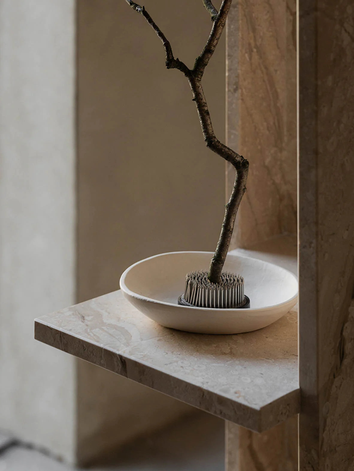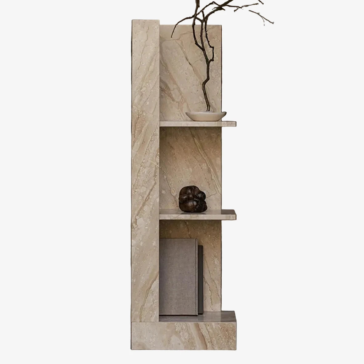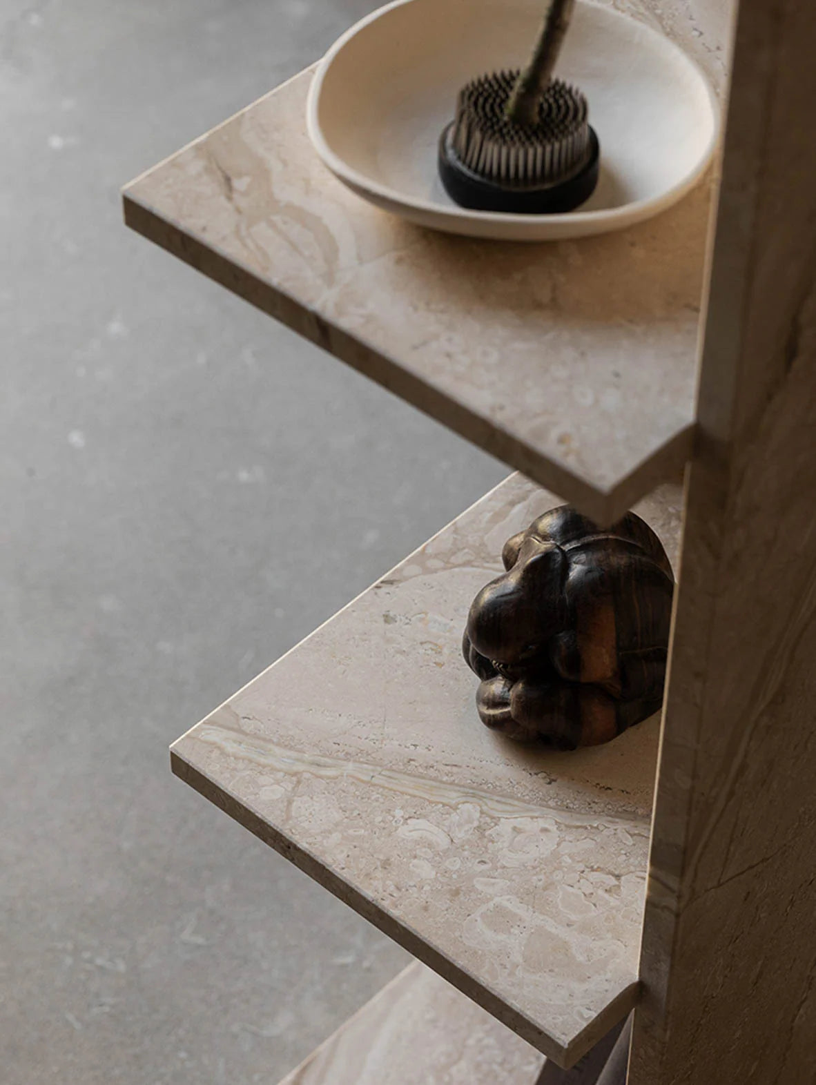CONE to architektoniczny, w całości marmurowy regał, zaprojektowany, by nadać znaczenie zapomnianym przestrzeniom. Jego smukła, kolumnowa forma idealnie wypełnia narożniki i wąskie przejścia, wprowadzając do wnętrza surowy luksus naturalnego kamienia.