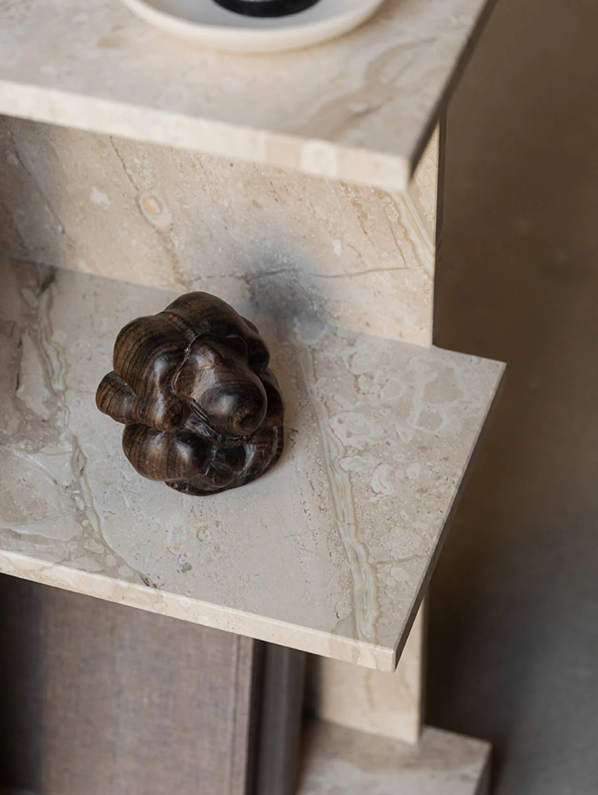 Regał Cone zrywa z nudą typowych "słupków". Wersja z marmuru Breccia wnosi do wnętrza ciepło beżu i brązu z wyrazistym, malarskim rysunkiem. Wariant Fior di Bosco to elegancja w tonacjach szarości, grafitu i oliwki, idealna do nowoczesnych, chłodniejszych aranżacji. Szczotkowane wykończenie kamienia sprawia, że powierzchnia jest matowa i niezwykle przyjemna, "satynowa" w dotyku.