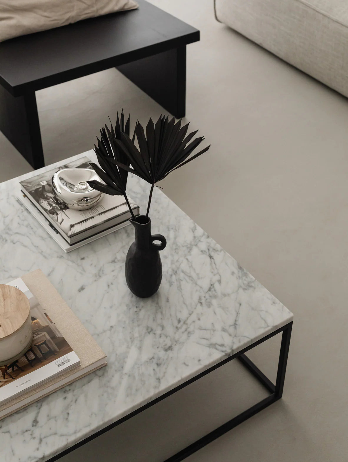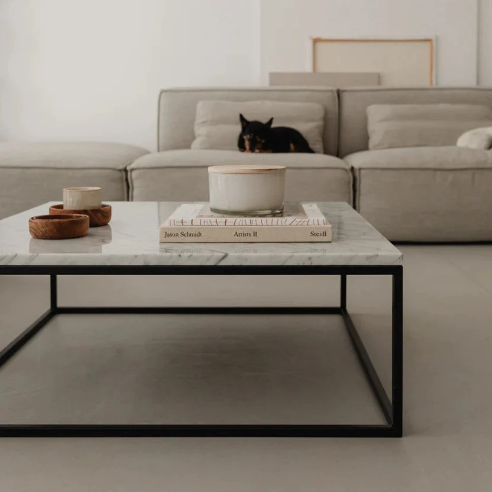 DIONE to niski, geometryczny stolik kawowy łączący surowe piękno naturalnego marmuru z architektoniczną lekkością stali, zaprojektowany z myślą o nowoczesnych wnętrzach typu "low lounge".