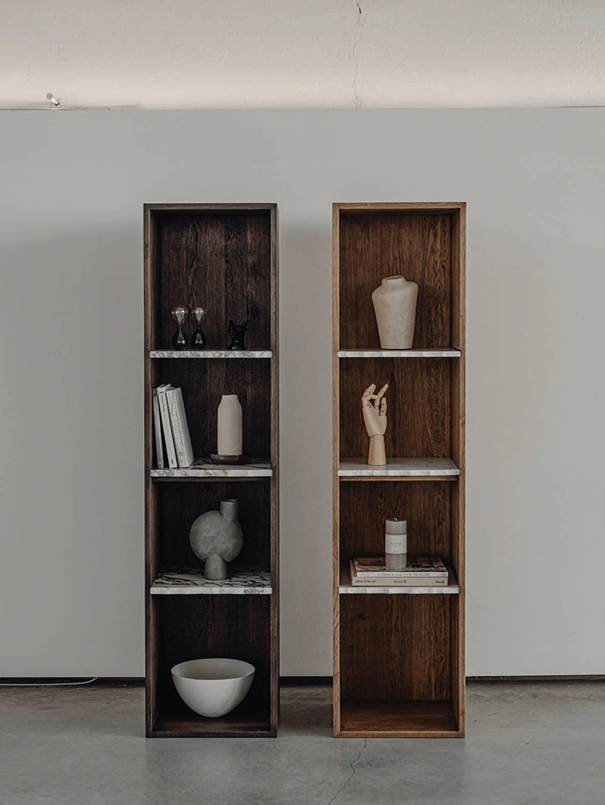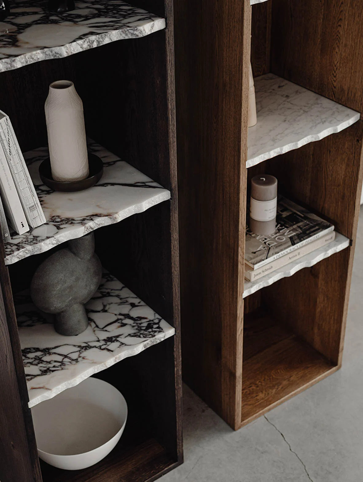 Ten mebel z kolekcji EDGE to ukłon w stronę estetyki wabi-sabi, która dostrzega piękno w niedoskonałości. ZUEL nie jest zwykłym miejscem do przechowywania – to pionowa gablota dla Twoich najcenniejszych przedmiotów. Kontrast między gładkim, ciepłym drewnem konstrukcji a surowym rantem marmurowych półek tworzy we wnętrzu fascynujące napięcie wizualne.