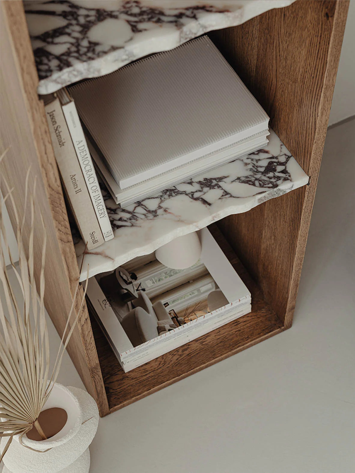 W modelu ZUEL najważniejszy jest detal krawędzi. Marmur nie jest tu idealnie oszlifowany "pod linijkę". Jego boki pozostawiono w formie surowej, chropowatej, odsłaniającej naturalną strukturę skały. To sprawia, że regał staje się łącznikiem między światem natury a uporządkowaną przestrzenią mieszkalną. Idealnie komponuje się z wnętrzami w stylu Modern Organic, Loft oraz Japandi.